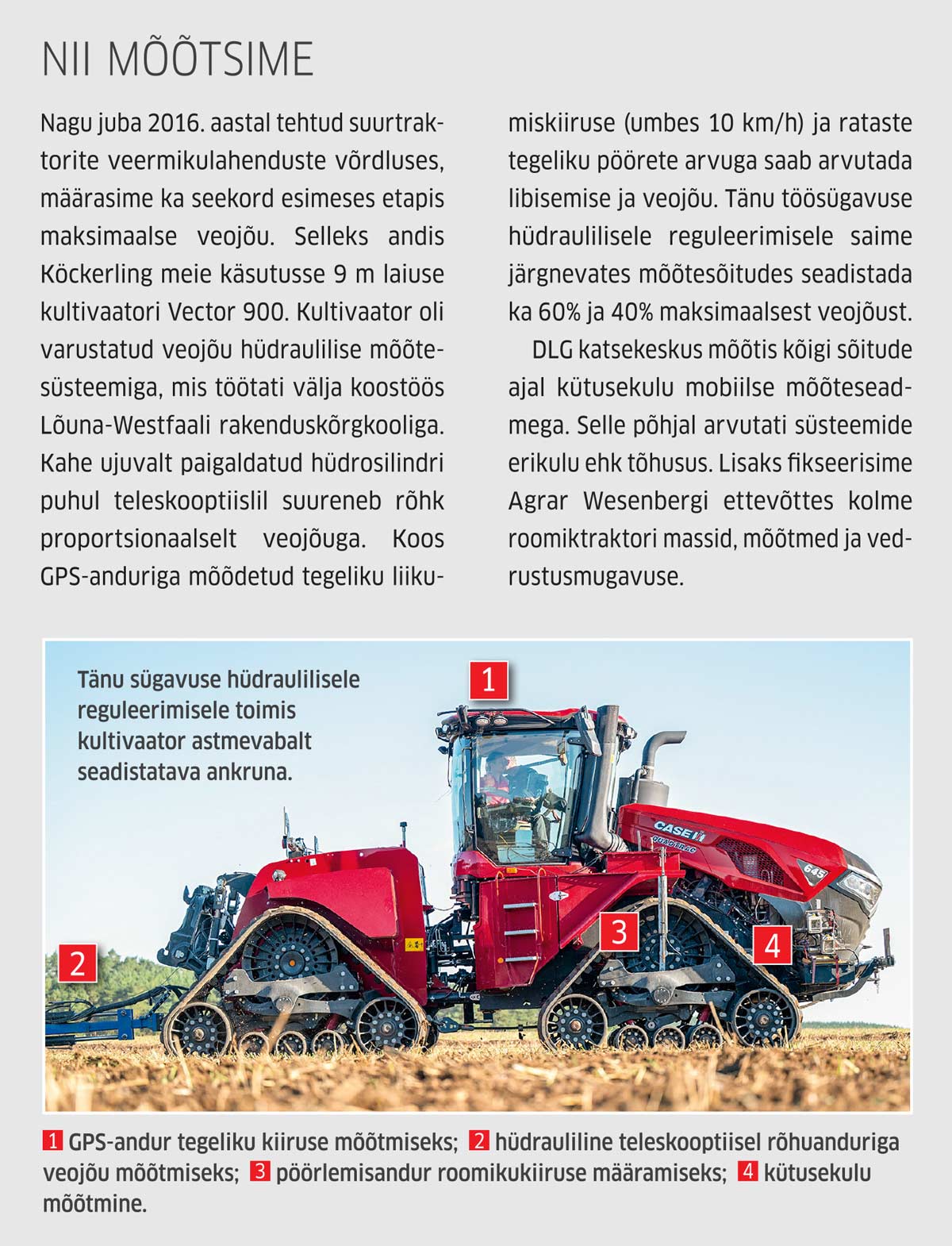 Sellegipoolest: ettenähtud 10 km/h juures sundis Köckerlingi 9 m laiune Vector-kultivaator kõik need hiiglased (ehkki alles tiibkäppadega ja enam kui 35 cm töösügavusel) põlvili. Ja et jääda õunte ja apelsinide võrdluse juurde: Xerion töötas kliendimasinana 900 mm laiustel lintidel (toetuspind 6,2 m² ja traktori laius 3,30 m). Seevastu olid Case IH ja John Deere oma traktorid varustanud 76 cm laiuste lintidega (toetuspind vastavalt 5,7 ja 5,8 m² ning laius 3 m).