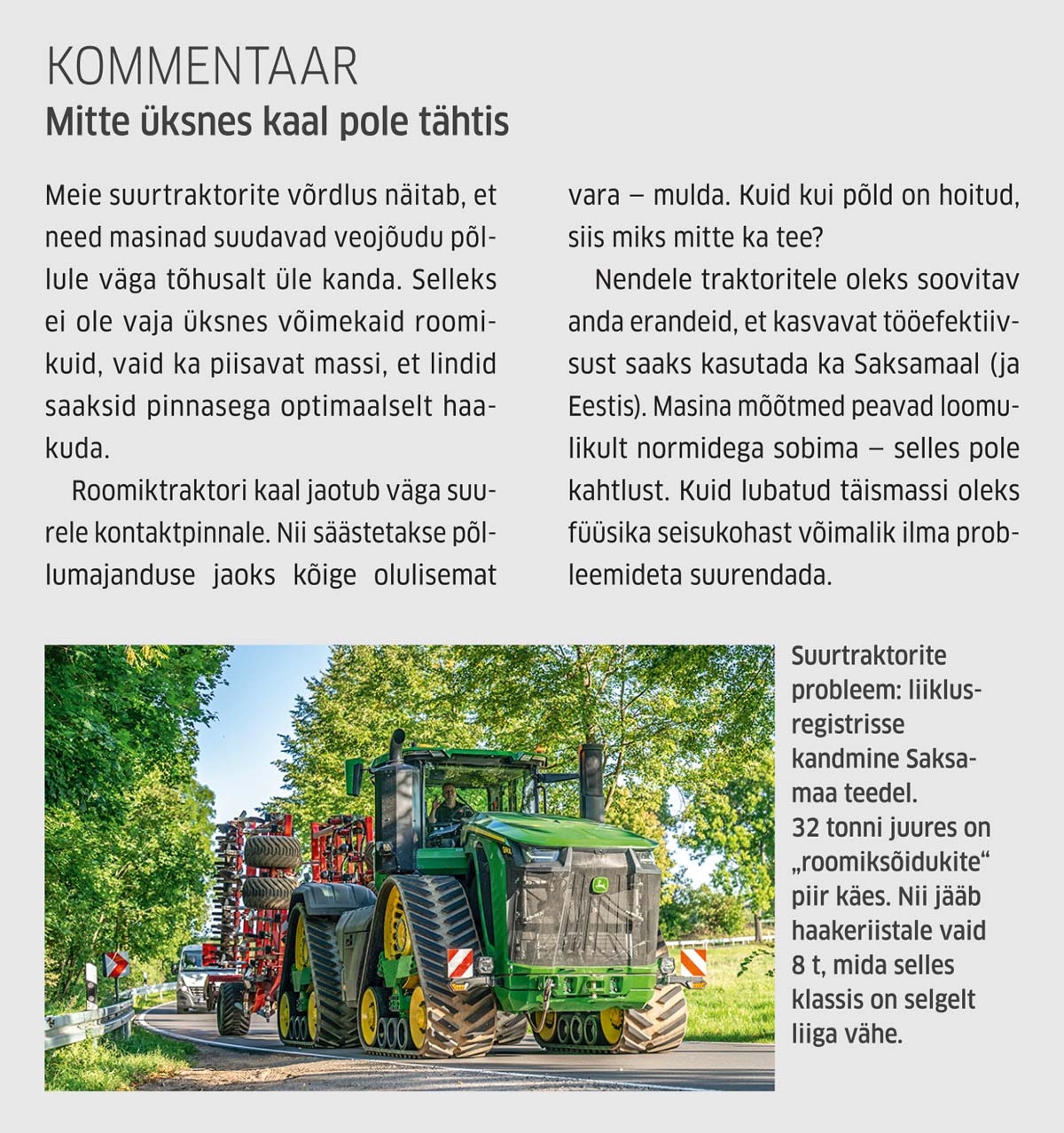 John Deere 9RX 830 mass on 34,8 t, mis teeb selle kandmise Saksamaa liiklusregistrisse keeruliseks (Eesti omast rääkimata). Kuna Case IH Quadtrac 645 ja Claas Xerion 12.650 kaaluvad „vaid“ umbes 30 t, jääb Saksamaal vähemalt 2 t kandevõimet haakeriistale (või 10 t kogu masinrongi kohta).