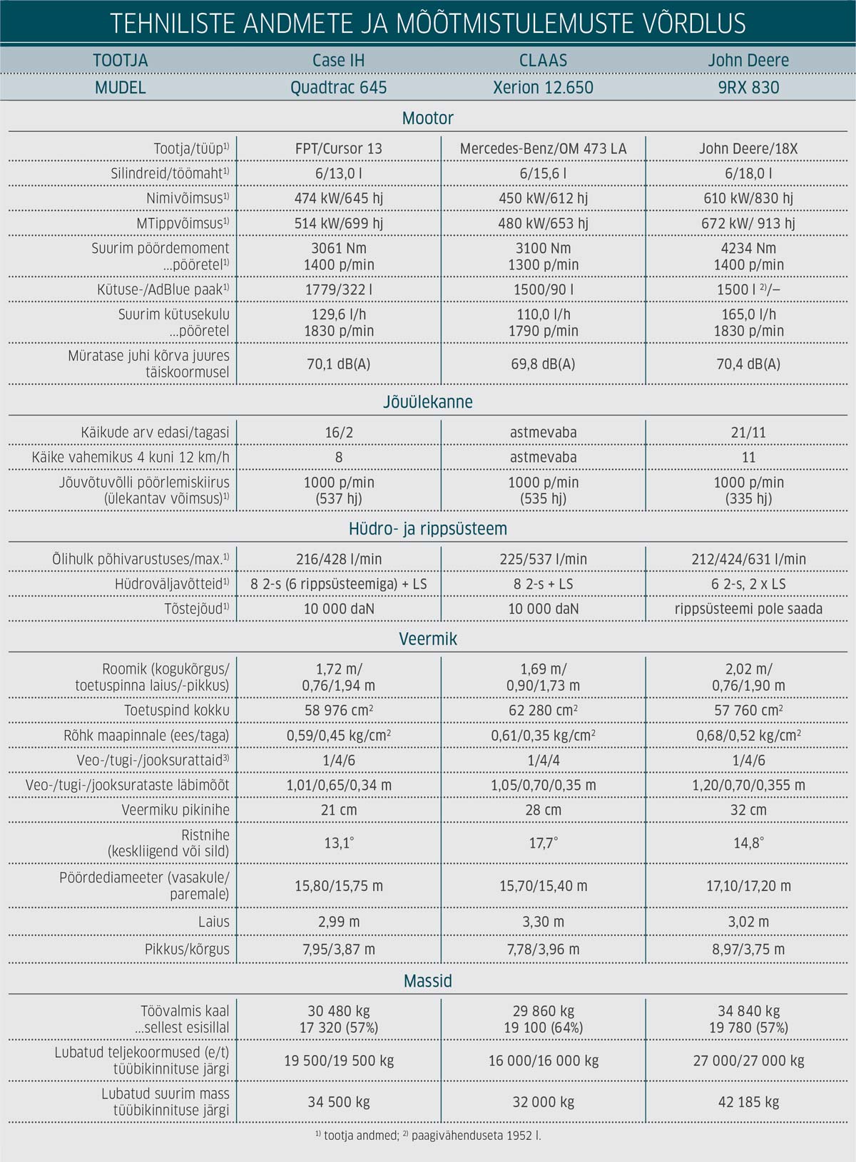 Kõik nende suurtraktorite üksikasjad oleme koondanud tabelisse „Tehniliste andmete ja mõõtmistulemuste võrdlus“.