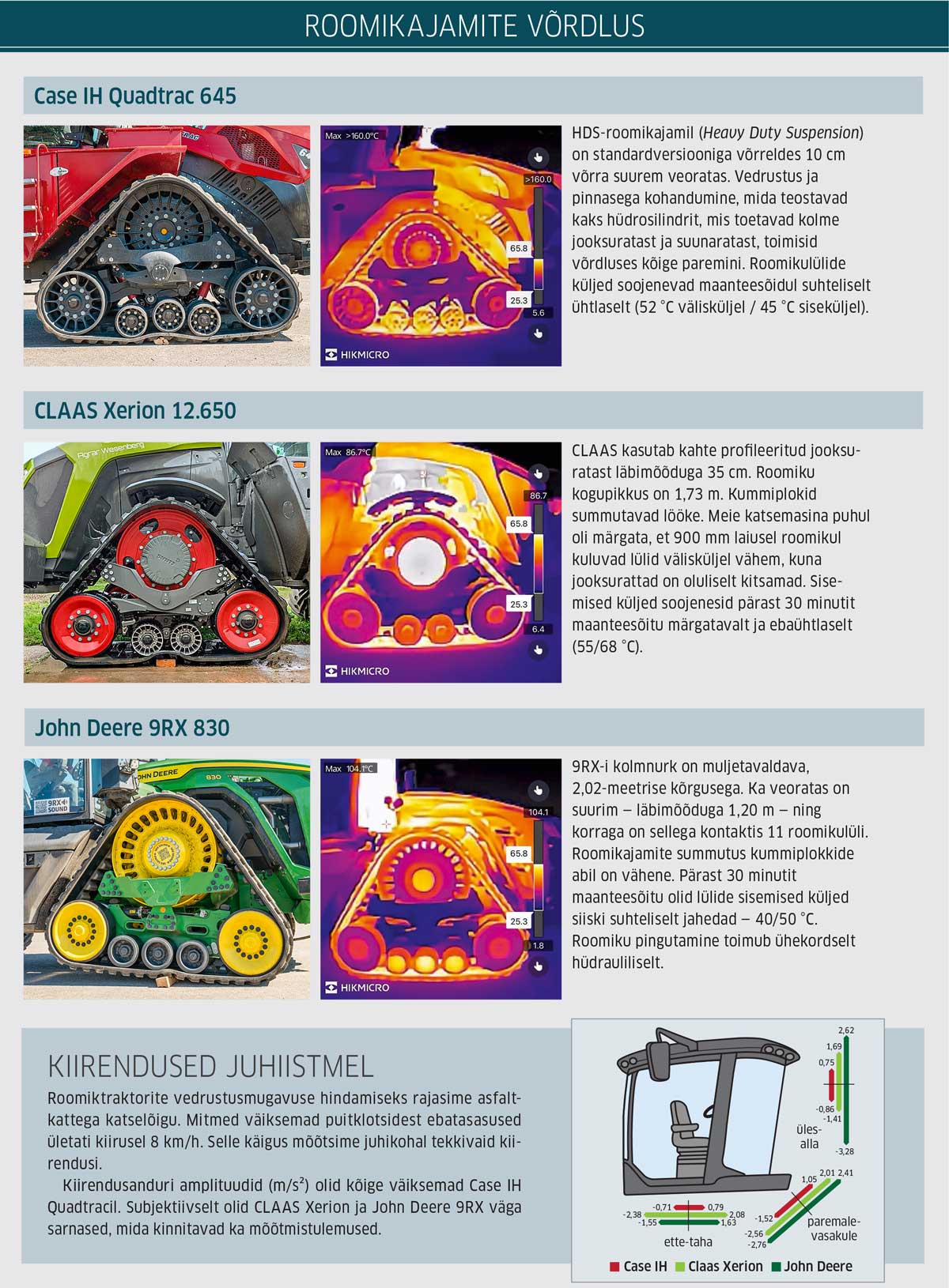 Kuid muutuvate koormuste juures veenab meid astmevaba käigukast (mida Case IH pakub vaid kuni mudelini Quadtrac 555), ning mitte ainult mugavuse tõttu. Ülekandearvu ja mootori pöörlemiskiiruse automaatne kohandamine säästab ka kütust. Roomikajamid on erineva ehitusega ning parima sõidumugavuse saavutasime meie võrdluses Case IH uute HDS-roomikutega.