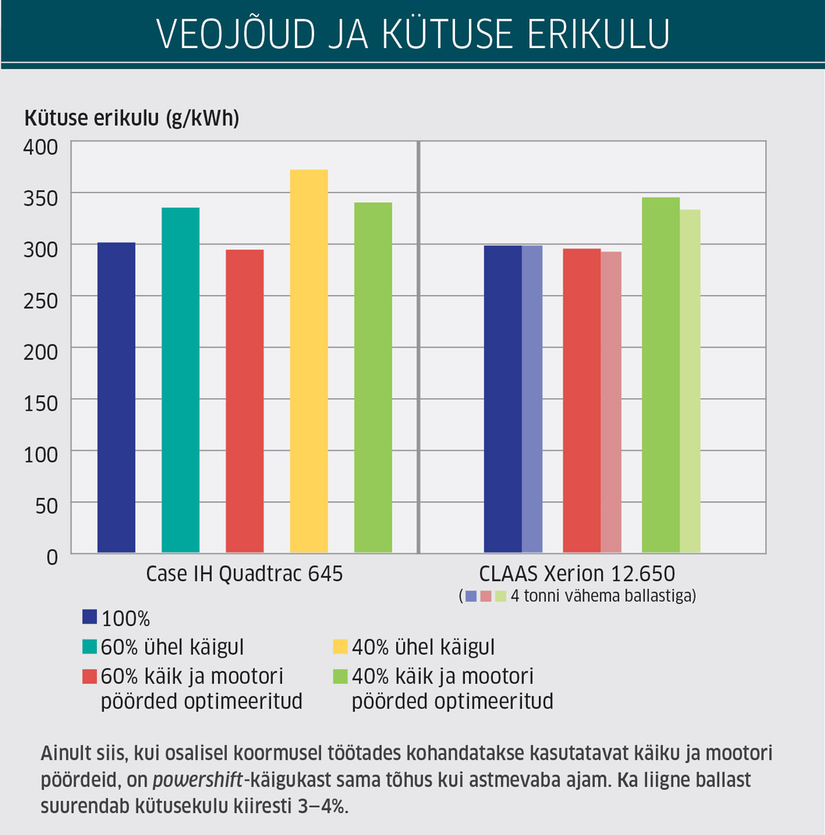 Sellel, et maksimaalsest veojõust vaid 40% juures on kütuse erikulu mõlema käigukastivariandi puhul kõrgem, võib olla mitmeid põhjuseid, sealhulgas traktori liiga suur mass. Selle mõju saime uurida Claas Xerioni puhul, kuna sealt saab vähese vaevaga eemaldada 4 t ballasti. Kuigi maksimaalne veovõimsus langeb seejuures veidi, 301 kW-ni (libisemise suurenemise tõttu), on erikulu siiski mõnevõrra parem kui ballastiga: 334 g/kWh võrreldes 346 g/kWh-ga.