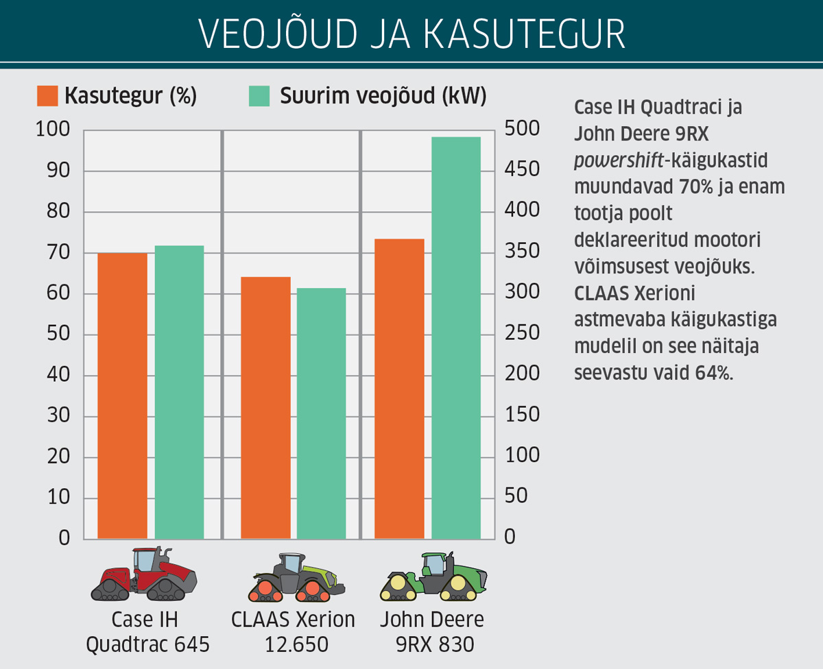 Tulemuste juurde: Case IH Quadtrac 645 suudab veovõimsusega 358 kW muundada veojõuks täpselt 69,8% oma mootori 514 kW suurusest tippvõimsusest. See on ligi 5% rohkem kui Claas Xerion 12.650-l, mis jõuab 64 protsendini ehk 307 kW-ni. Quadtrac tarbib seejuures 4-protsendilise läbilibisemise juures kütust 302 g/kWh (ümberarvutatuna umbes 296 g/kWh 2% libisemise korral).