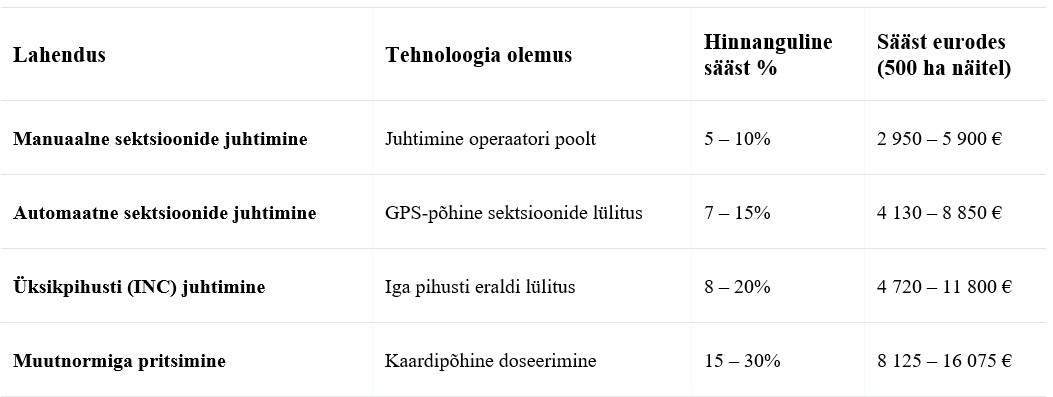 Üks esimesi ja kiiremini tasuvaid samme täppispritsimise suunas on sektsioonide juhtimine. Näiteks 500-hektarilisel teraviljafarmil, kus taimekaitsevahendite aastane kulu on ligikaudu 59 000 eurot, annavad erinevad lahendused märgatava säästu.
